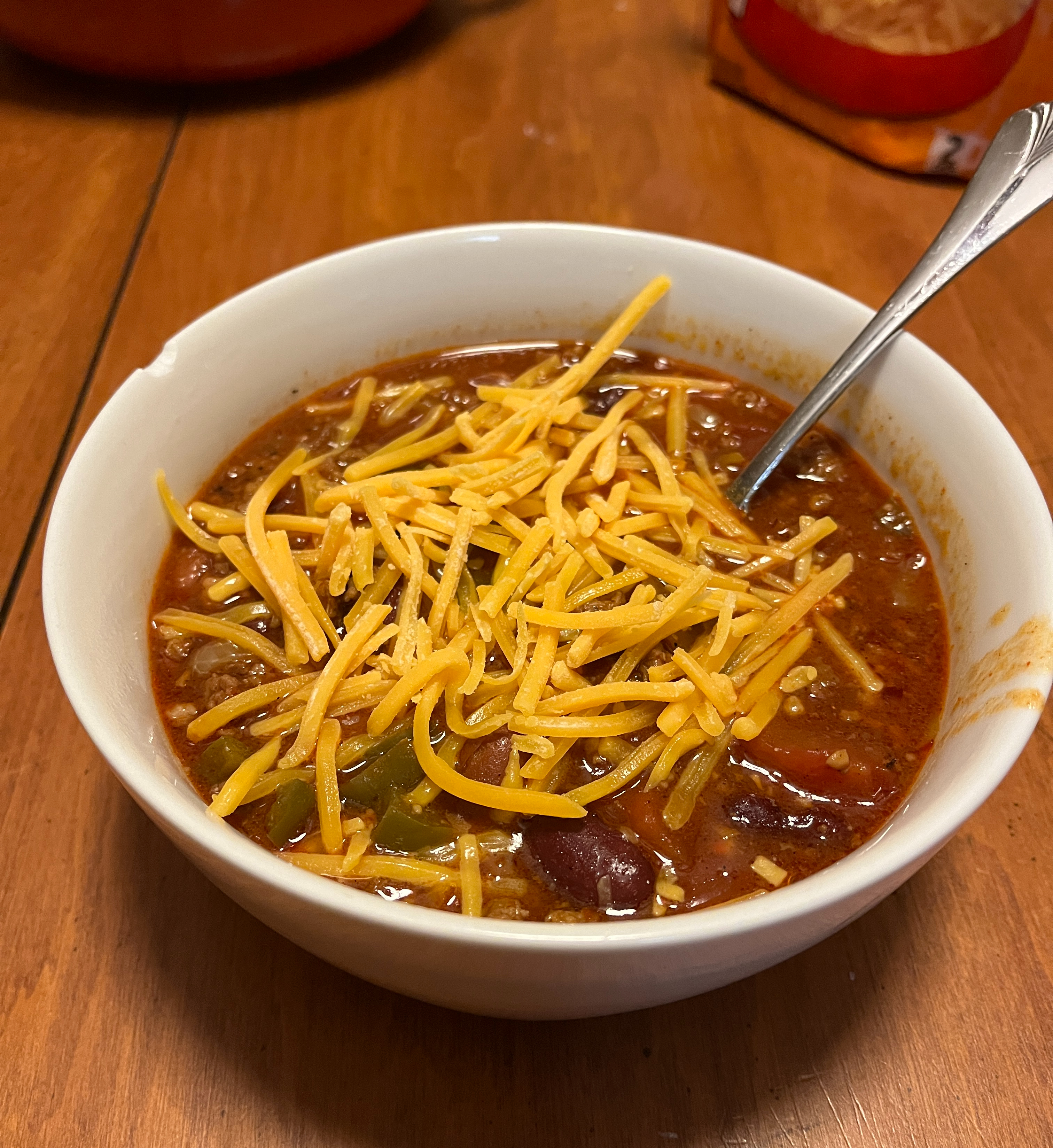 The chili could also not be more basic. Ground beef, spicy sausage, onion and garlic, dark and light kidney beans, pinto beans, green peppers, pepperoncini, fire-roasted diced tomatoes, tomato sauce, chili seasonings, Worcestershire sauce, Tabasco, and plenty of time to stew together.