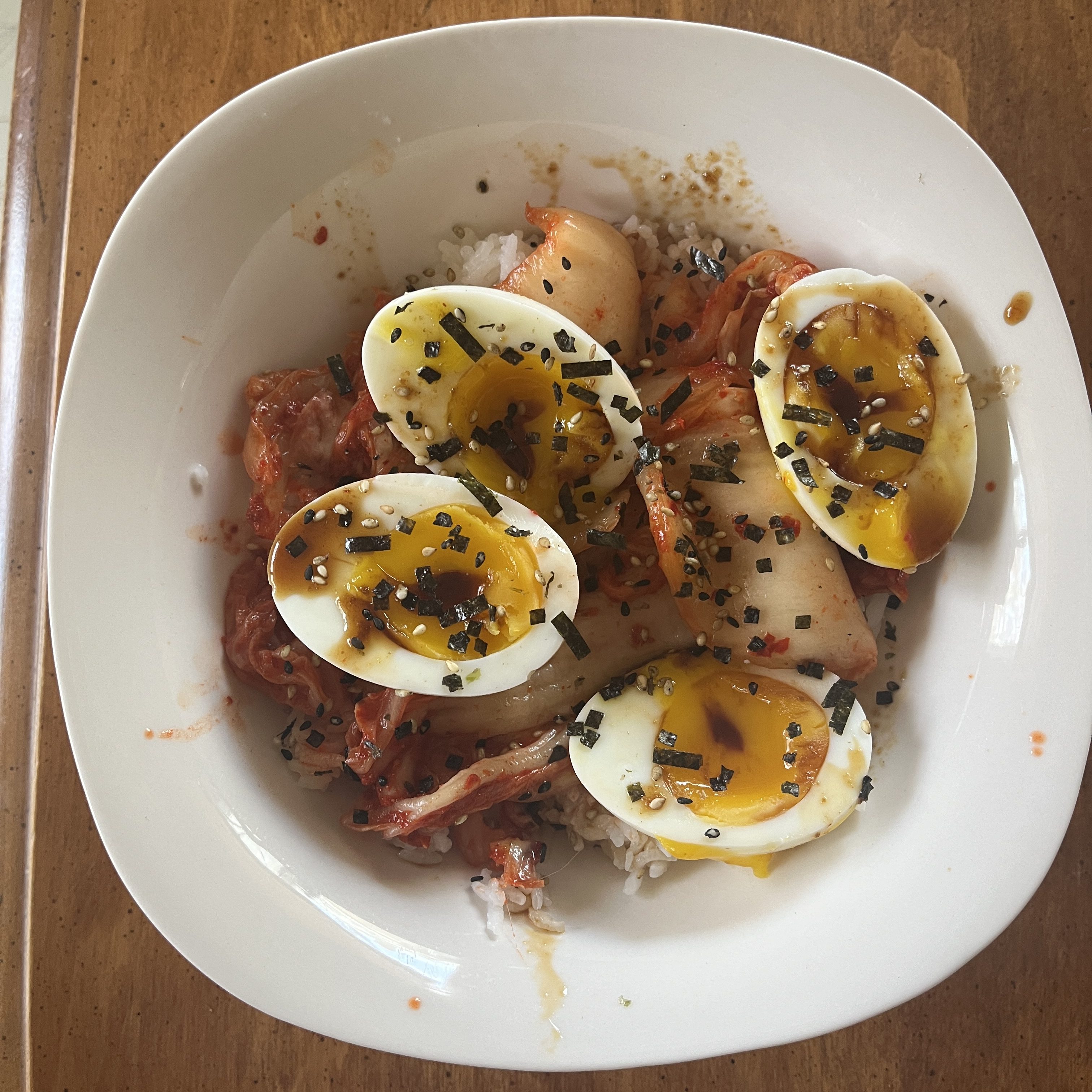 I’m still obsessed with the 7-Minute Egg I mentioned back in Week 1. I’ve been having it any way I can. Either in a rice bowl (with kimchi style napa cabbage in left picture) or as a yummy protein on a variety plate.