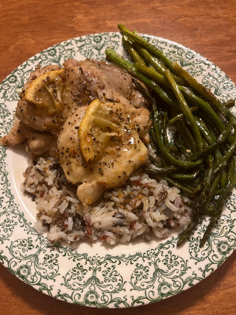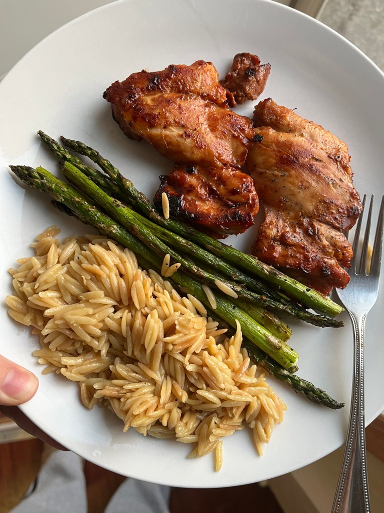 Jackson is usually sick of chicken and asparagus by mid-May with how much I fix it. I think it’s the perfect combo, and it can have so many variations! On the left, I baked chicken thighs after quickly dressing it with lemon and herbs and made a side of wild rice. On the right is (again) chicken thighs with a BBQ and Italian marinade mix, this time grilled, with an orzo pilaf.