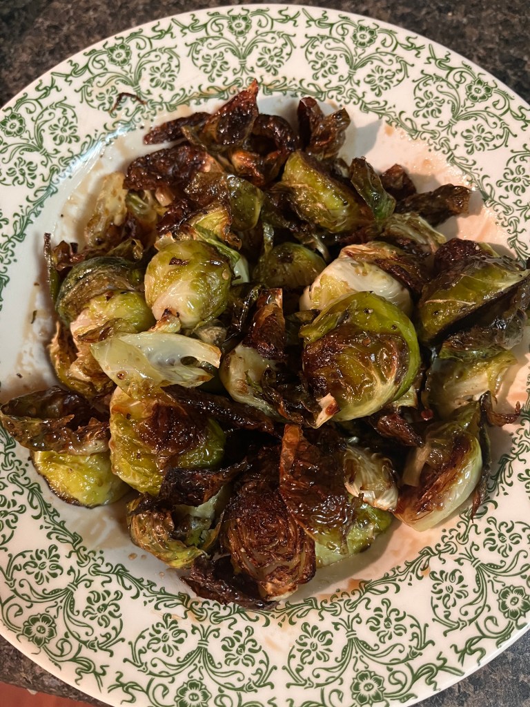 For the right image: Any time I need to use up brussels sprouts I bake them. cut in half, olive oil with salt and pep on 375ish until crispy. Jackson prefers them honey-balsamic style so I usually top with a nice balsamic vinegar and, you guessed it, honey.