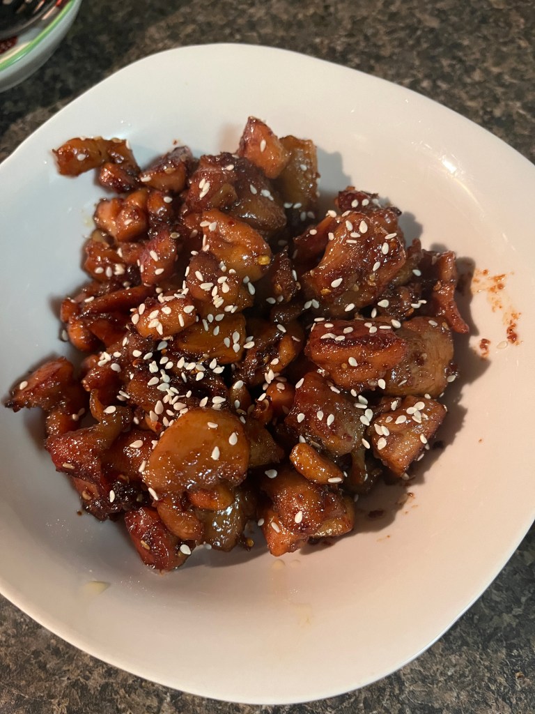 For the left image: I had to use up the rest of a package of chicken thighs, so I cut alllllll the fat off and marinaded it over night in Bachan’s® The Original Japanese BBQ Sauce. I added cayenne and chili flakes for spice and then wok’d it up! The sugars in the sauce make the chicken beautifully caramel and sticky.